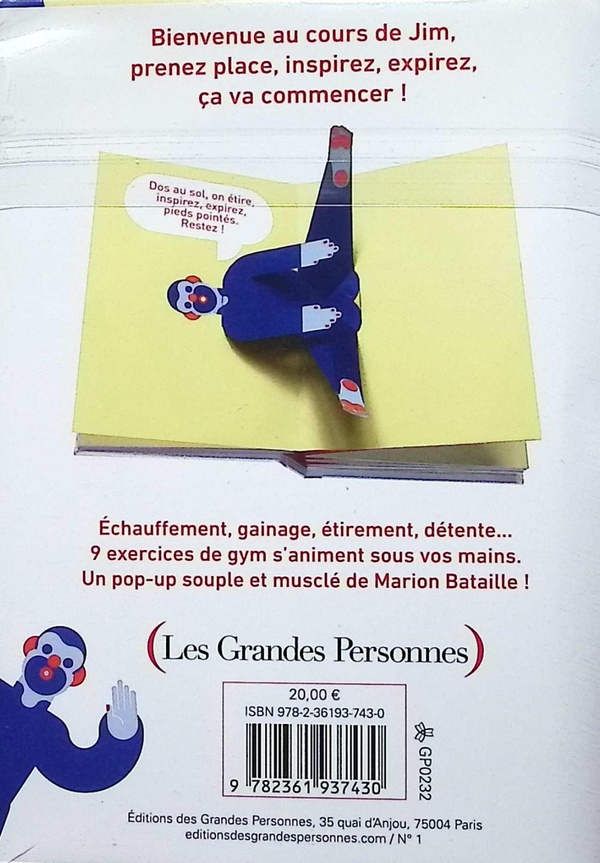 Coach sportif, Jim vous invite à son cours de gym et saura vous motiver à garder le rythme jusqu’au bout ! Échauffement, gainage, étirement, détente… 9 exercices s’animent sous vos mains grâce aux pop-ups pleins de vitalité de Marion Bataille. Imprimé en couleurs Pantone, ce petit livre ravira les petits et les grands, les fans d’activités sportives et ceux qui préfèrent regarder les autres en faire.